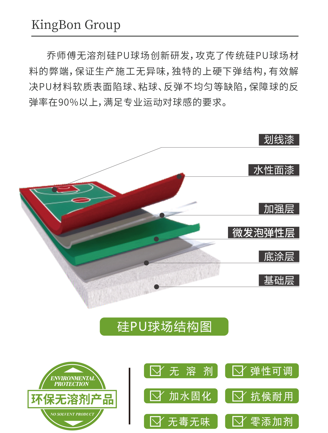 无溶剂硅PU球场创新研发,攻克了传统硅PU球场材料的弊端,保证生产施工无异味,独特的上硬下弹结构,有效解决PU材料软质表面陷球、粘球、反弹不均匀等缺陷,保障球的反弹率在90%以上,满足专业运动对球感的要求。